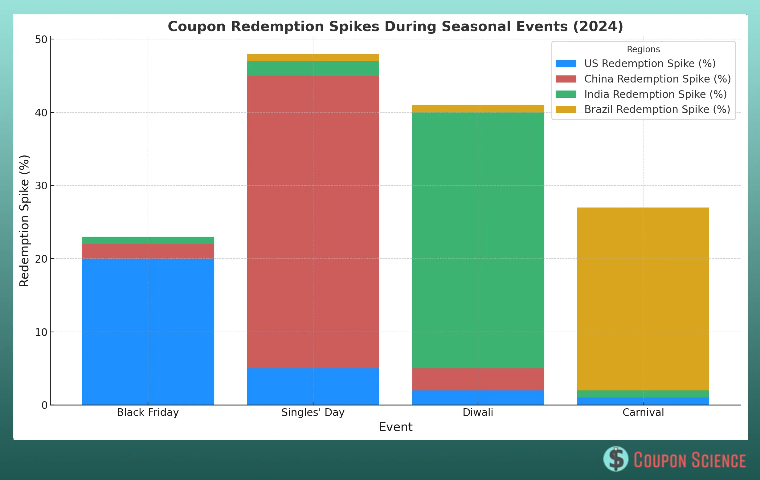 Holidays and cultural events trigger sharp lifts in coupon use. Examples: